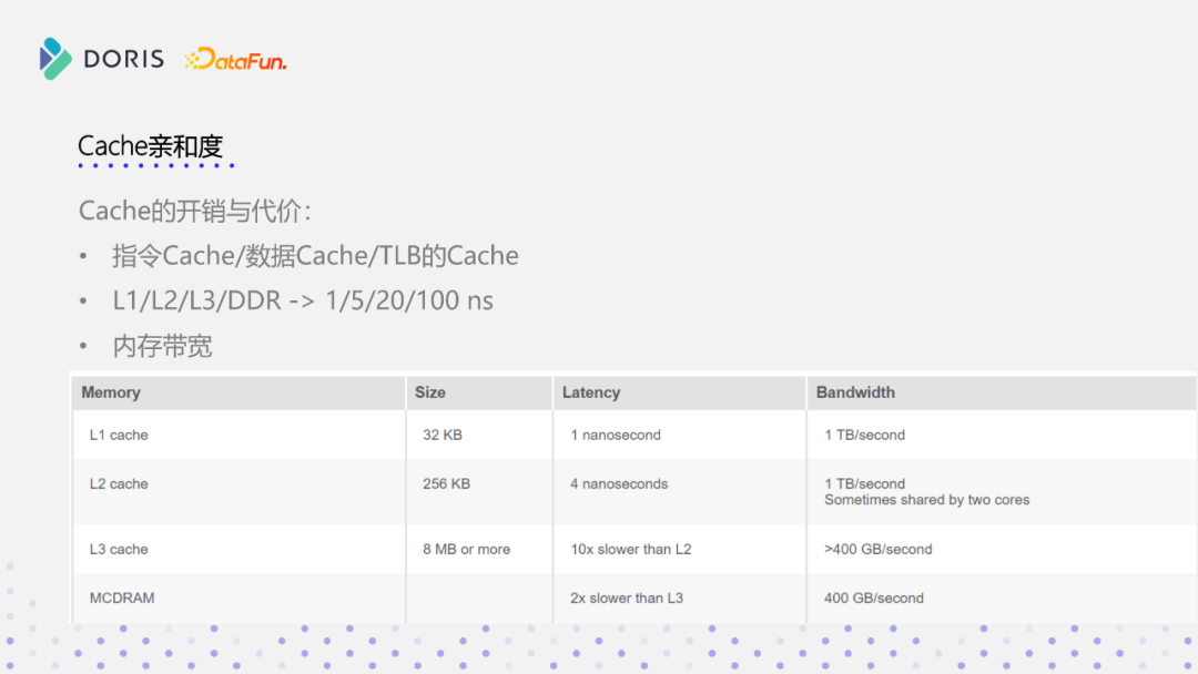 从CPU的角度分析,Cache主要分为三个部分:首先是CPU指令的Cache,其次是数据的Cache,最后是TLB(Translation Lookaside Buffer),用于将虚拟地址转换为物理地址。实际上,TLB也可以视为一种Cache,存在于CPU内部,用于加快地址转换过程。上述三个组成部分共同构成了我们通常所说的Cache体系,它们的性能直接影响到SQL查询的整体效率。如果这三部分的管理不当,可能会对SQL查询造成显著的性能影响。根据英特尔官方提供的数据,下表展示了L1、L2、L3缓存以及DDR内存访问的时间开销。从表中可以看出,L1缓存的访问时间仅为1纳秒,L2缓存为4到5纳秒,而L3缓存的访问时间大约是L2的十倍。实际上,访问主内存(DDR)的时间可能会超过100纳秒。由此可见,如果数据能够在L1缓存中找到,那么节省下来的CPU时钟周期将是非常显著的,这段时间内CPU可以执行大量的额外指令。相反,一旦需要访问DDR内存中的数据,不仅会遇到较长的访问延迟,还会涉及到内存带宽的问题。由于内存带宽是所有硬件逻辑程序共享的资源,因此还涉及到复杂的内存带宽调度问题。因此,为了提升SQL查询的执行效率,应尽可能优化程序的Cache亲和度,确保数据能够高效地被缓存和访问。- 无法进行函数内联:虚函数是动态调用的,编译器无法对其进行内联优化。因此,在实际调用时需要查找虚函数表,而这个查表过程是编译器无法内联的。函数内联的意义在于为编译器提供更多优化空间,但由于虚函数调用无法内联,编译器获取的信息较少,从而减少了代码优化的机会,这对性能有较大影响。