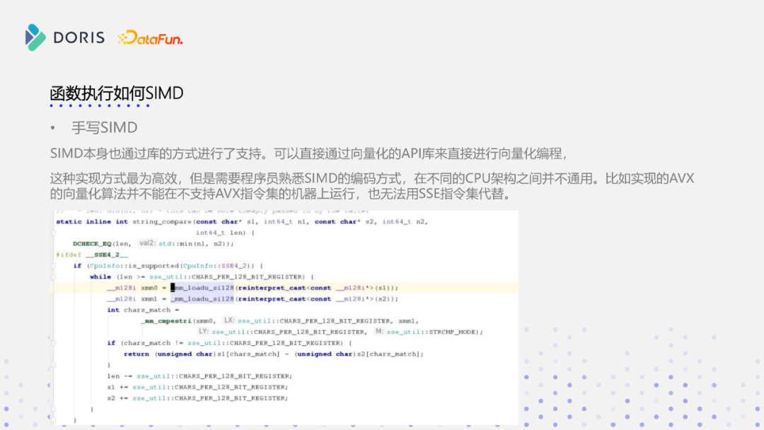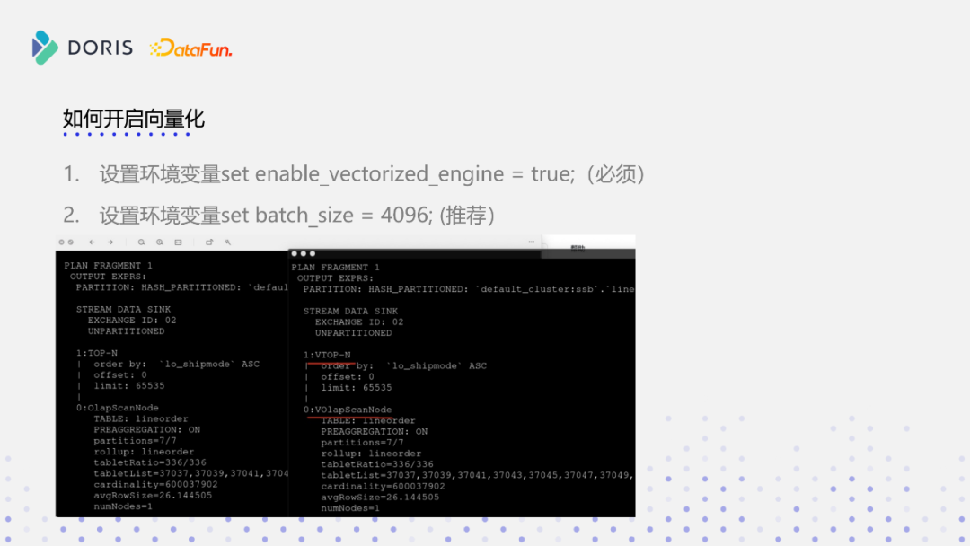 通过以上方法,可以有效地确认编译器是否成功进行了自动向量化,并进一步分析未向量化的原因,从而优化代码性能。SIMD技术不仅通过硬件指令集提供支持,还通过库的形式提供了向量化API,允许开发者直接进行向量化编程。这种方式在性能上是最为高效的,但同时也带来了较高的开发成本。程序员需要熟悉SIMD的编码方式,并且必须关注底层CPU架构的细节。例如,使用编译器自动向量化时,编译器会处理这些底层细节,无需程序员过多关心。但一旦选择手写SIMD代码,就需要考虑具体的指令集支持问题。比如,实现一个abs函数的向量化算法时,如果目标机器不支持特定的abs指令集,代码将无法运行。这种方式虽然高效,但通用性和兼容性较差。例如,如果要在多个不同架构的CPU上运行,需要分别为x86、ARM和RISC-V等架构编写不同的代码。这不仅增加了开发和维护的工作量,还提高了程序员的薪资成本。在实现Doris的向量化过程中,为了规避这些问题,我们综合了自动向量化和手写SIMD的优点,选择了基于SSE(Streaming SIMD Extensions)指令集来实现所有功能。SSE是x86架构中最通用的向量化指令集,目前97%以上的服务器都支持这一指令集。通过这种方式,我们既保证了代码的高效性,又确保了其广泛的兼容性,减少了开发和维护的成本。开启向量化首先就是设置环境变量,设置一个set enable_vectorized_engine = true,如下图所示,我们可以看到node上会带一个v的结构,这个其实跟汇编指令生成的SIMD指令集是一样的,这个v就代表开启向量化。另外一个参数是我们在实际的测试当中测下来的最佳实践,set batch_size = 4096。