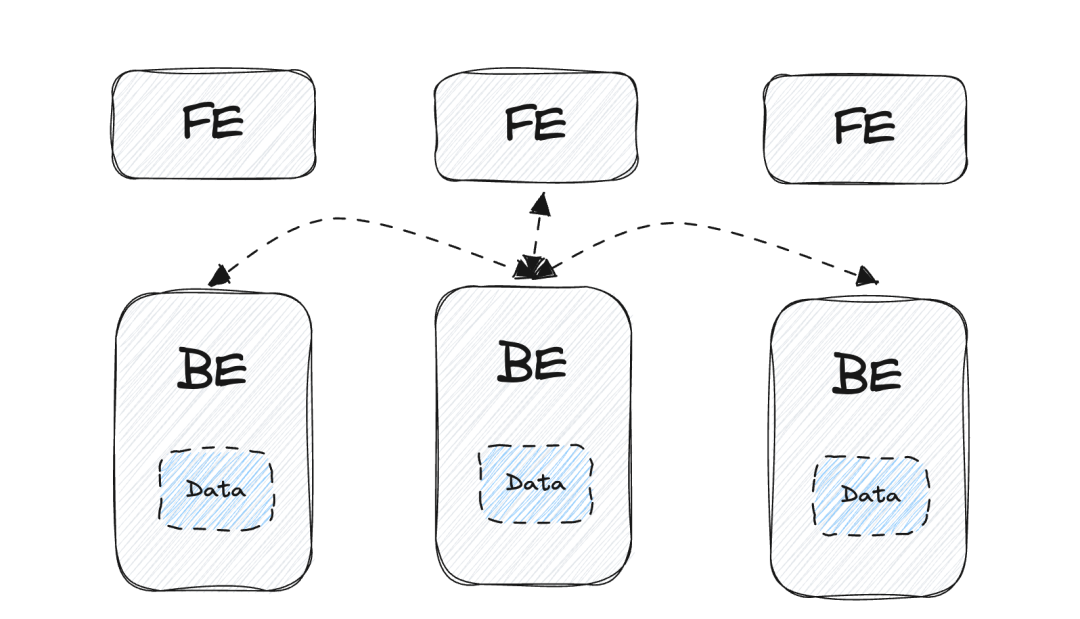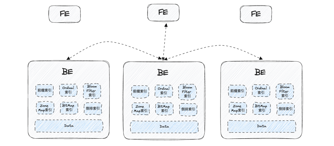数据分布:数据被分割成多个部分,每个BE节点都独立地存储一部分数据,节点之间不共享存储,每个节点独立处理自己所负责的数据。