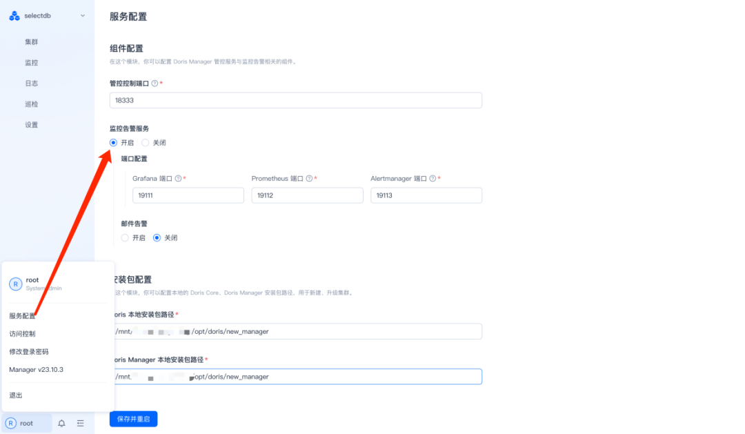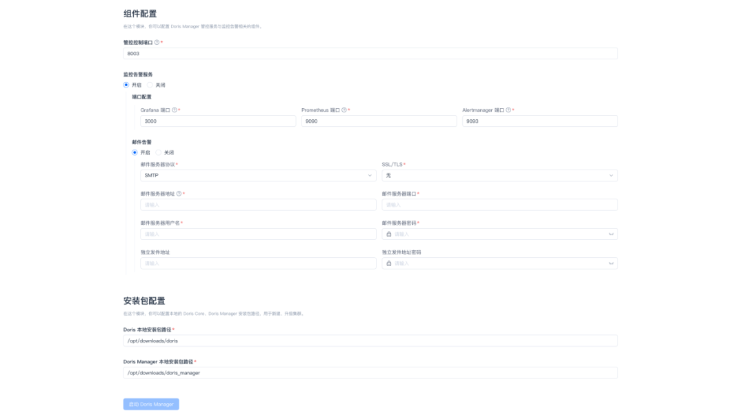 根据自己环境填写,如果暂时用不到监控告警模块可以选择[关闭];填写后点击【启动Doris Manager】。当前没有开启监控告警服务,后续可以重新打开。