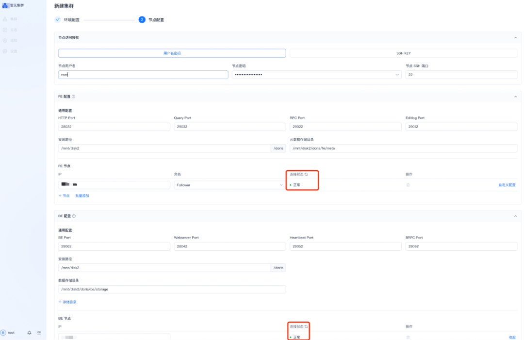 填写FE的IP/HTTP端口/JDBC端口以及节点用户名/密码/SSH端口后,Manager会自动识别待接管集群的FE和BE节点信息。