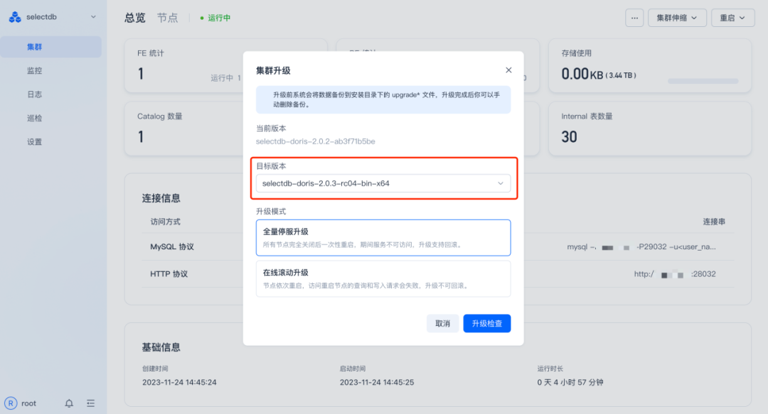 选择目标版本,这里用的是SelectDB 2.0.3 rc04作为升级的目标版本,之后直接点点即可。
