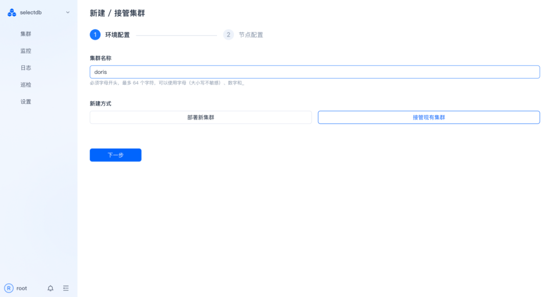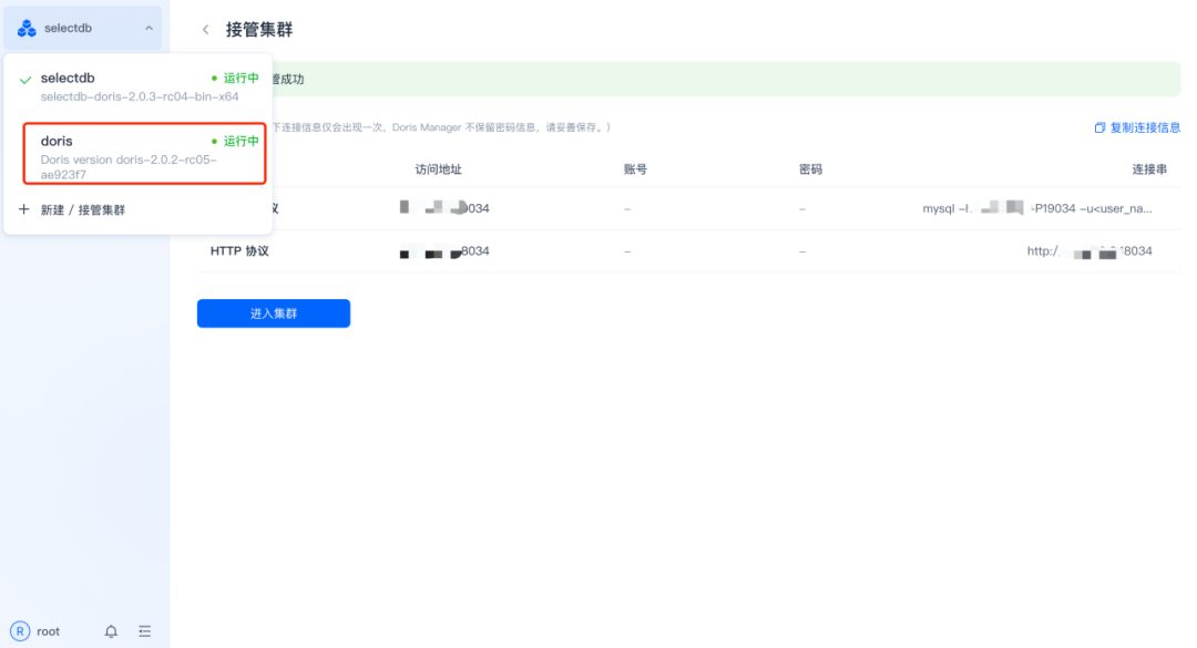 Manager支持同时管理多套集群。在已有一套集群的情况下,可以继续新建集群或者接管现有集群。本次以接管集群为例,接管现有的Doris 2.0.2集群。