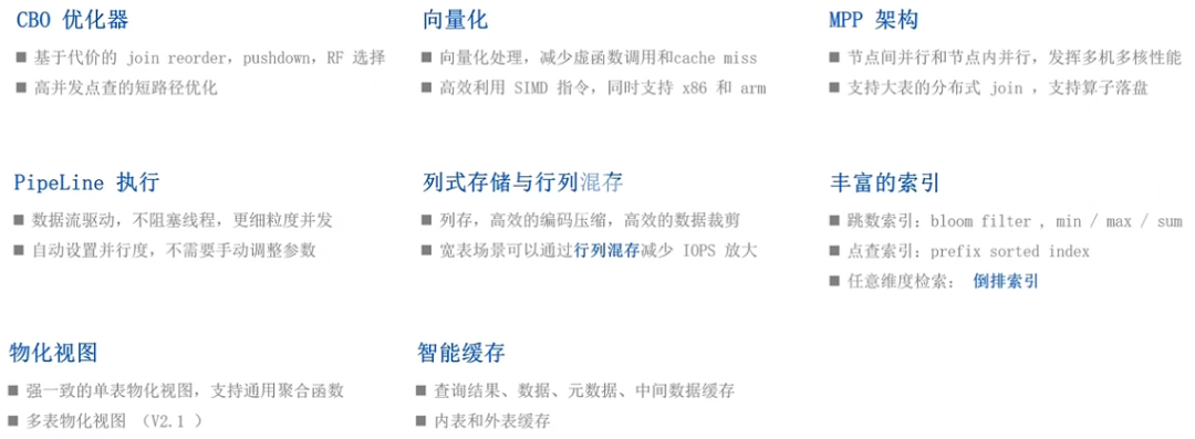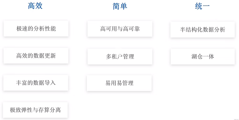 ■ 高效:极速的分析能力、高效的数据更新、丰富的数据导入、极致弹性及存算分离