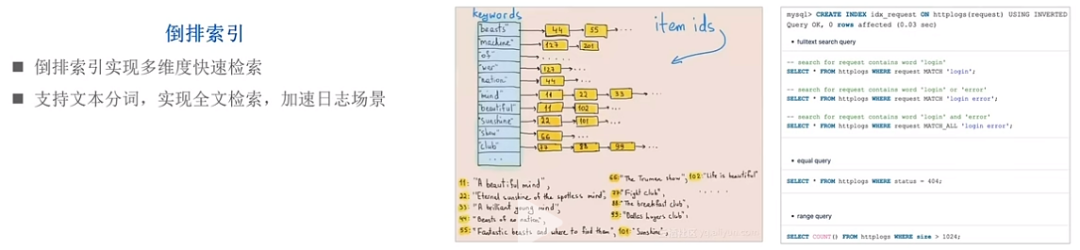 Doris除了拥有以上功能来完成极速的分析能力外,还实现了倒排索引来加速数据分析查询