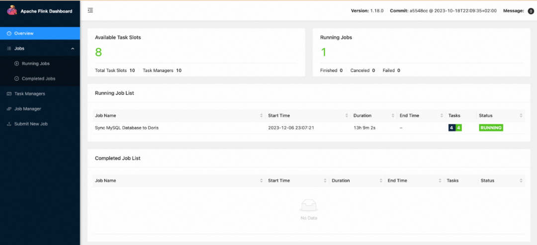 在 Flink Web UI,可以看到一个名为 Sync MySQL Database to Doris