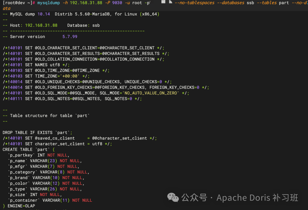 同时请注意,由于 Doris 中没有 MySQL 里的 tablespace 概念,因此在使用 MySQL Dump 时要加上