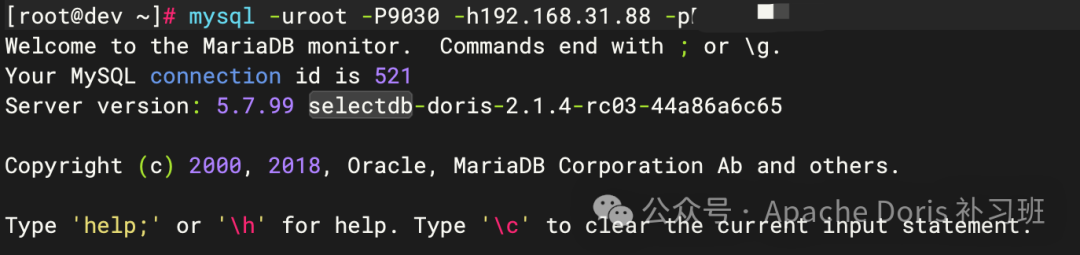 mysql -u ${USERNAME} -P ${FE_QUERY_PORT} -h ${FE_HOST_IP} -p ${PASSWORD}