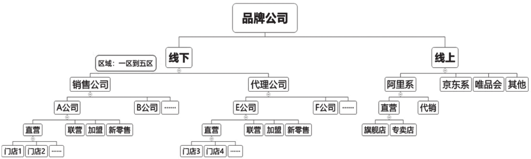 本次项目聚焦于特步儿童业务的BI分析需求,其销售渠道组织架构如图14-1所示。本次项目要求整合线上、线下数据,打通数据孤岛,提供全口径、准确、实时的数据分析结果。