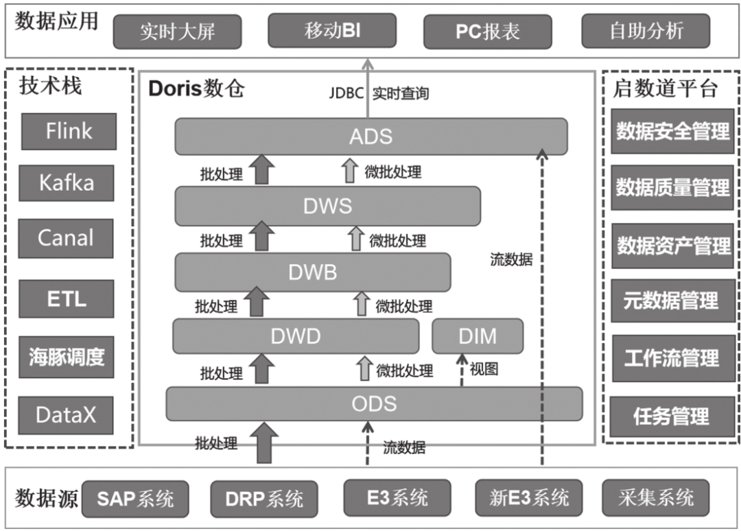 本次项目选择基于Doris搭建整个数据仓库,辅以启数道平台为数据中台,完成任务管理、工作流管理、元数据管理、数据资产管理、数据质量管理、数据安全管理等,如图14-2所示。