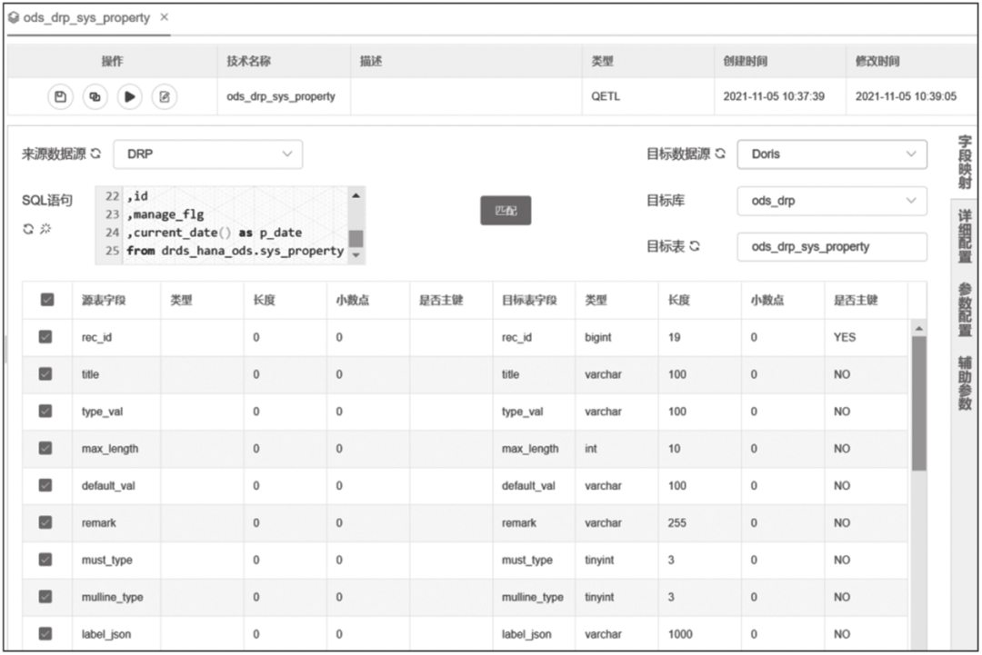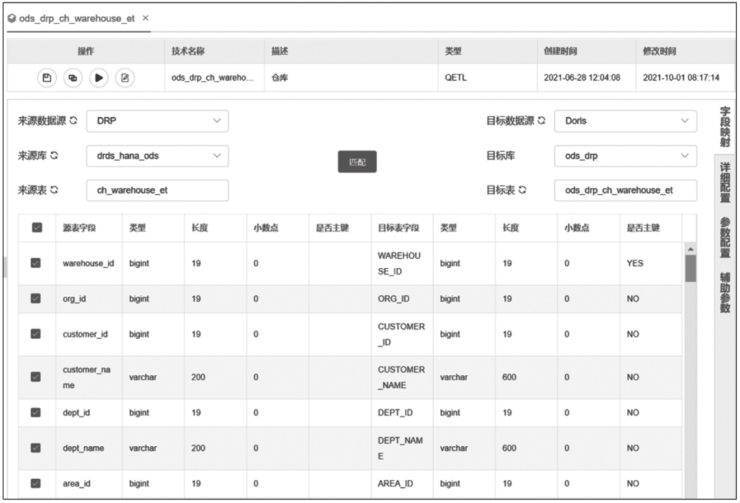 启数道批量数据同步功能基于DataX实现,提供界面化操作,只需简单几步即可完成表同步任务的创建。如图14-3所示,选择来源表和目标表,点击“匹配”按钮后,字段自动进行同名映射,然后保存。