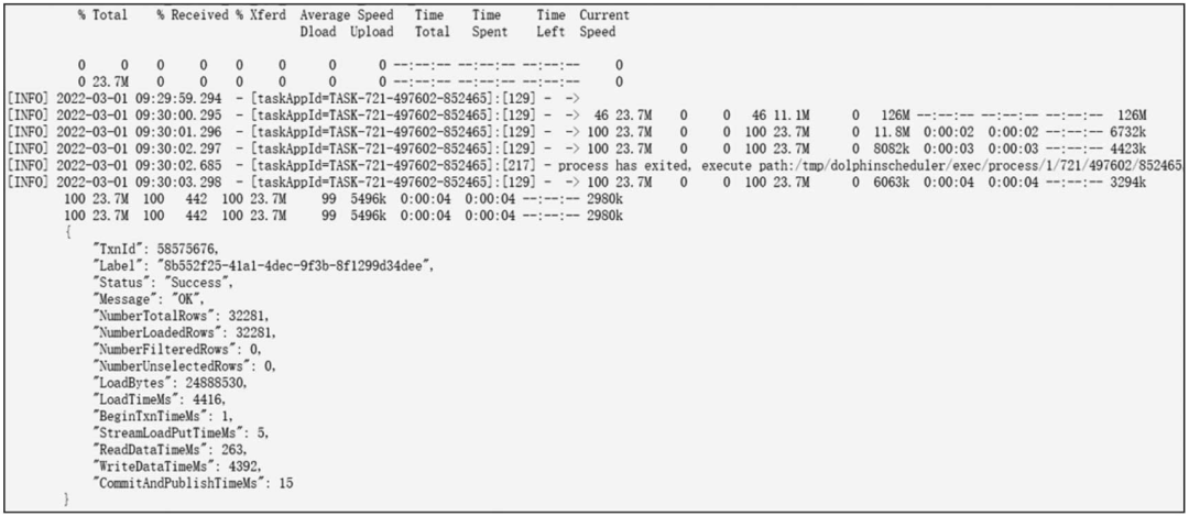 在项目初期,Doris未发布DataX插件,仅通过原始的JDBC插入数据,达不到性能要求。产品团队开发了DataX加速功能,先将对应数据抽取到本地文件,然后通过Stream Load方式加载入库,可以极大地提升数据抽取速度。数据读取到本地文件取决于网络宽带和本地系统读写性能,加载2000万条记录(数据文件大小12.2GB)仅需5 min,截图如图14-4所示。