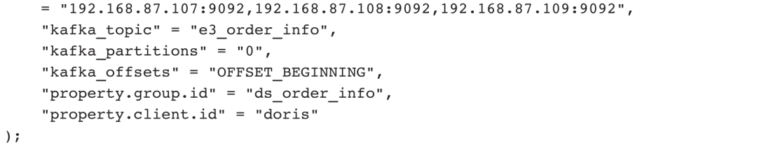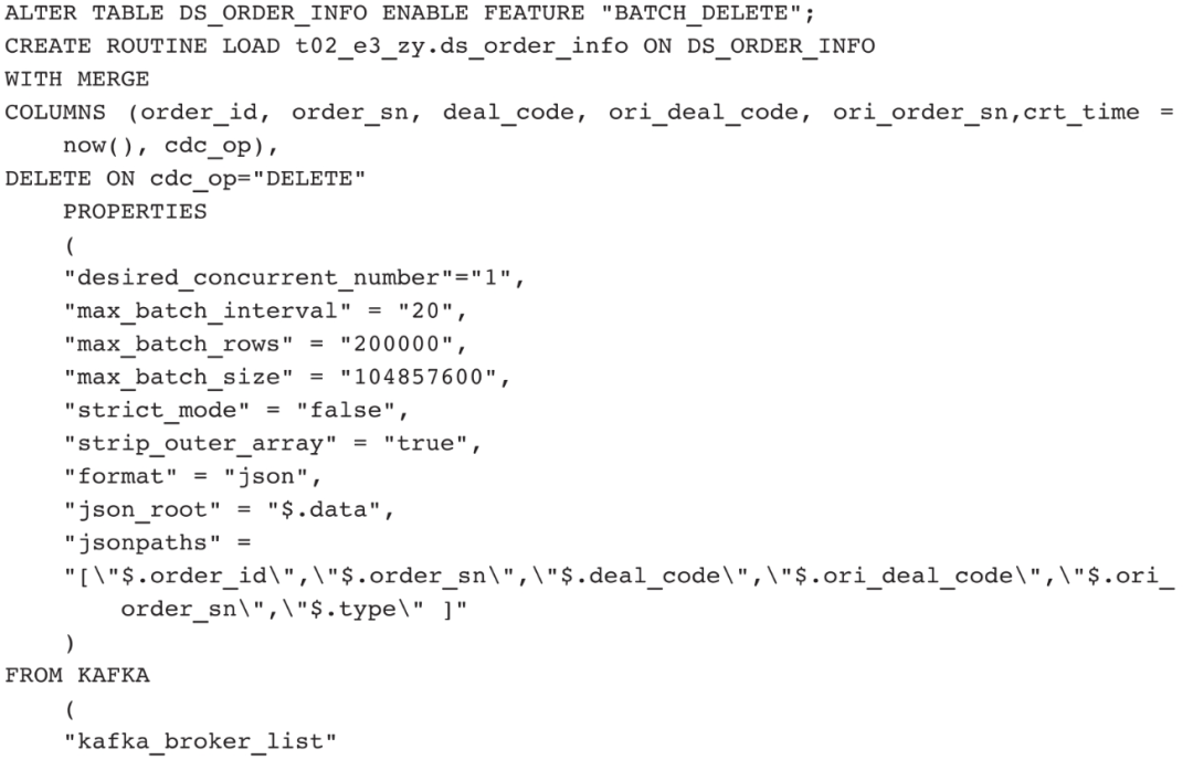 然后在Doris中新建ROUTINE LOAD任务,代码示例如下:
