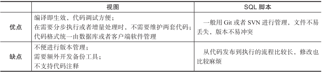 通过前文的介绍,我们了解到Doris不支持存储过程。综合考虑视图和SQL脚本开发,我们最终选择了视图。二者的对比如表14-1所示,仅供各位参考。