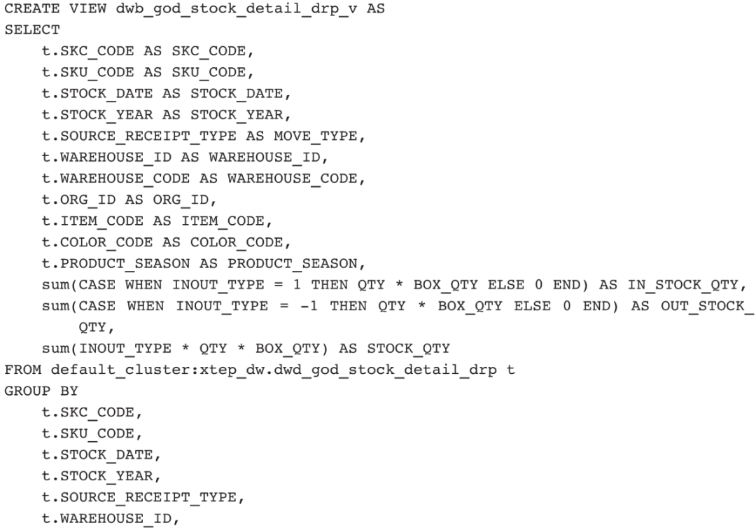 除ODS层以外,视图和表几乎是一一对应的,所有的视图命名在对应目标表名基础上增加_v结尾。当有同一个数据多次加工需求时,推荐使用with as语句来处理,若需要建多个视图,可以根据业务含义建不同名的视图。