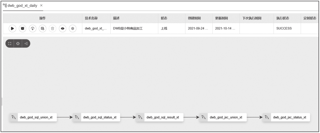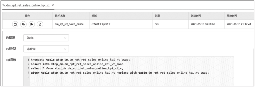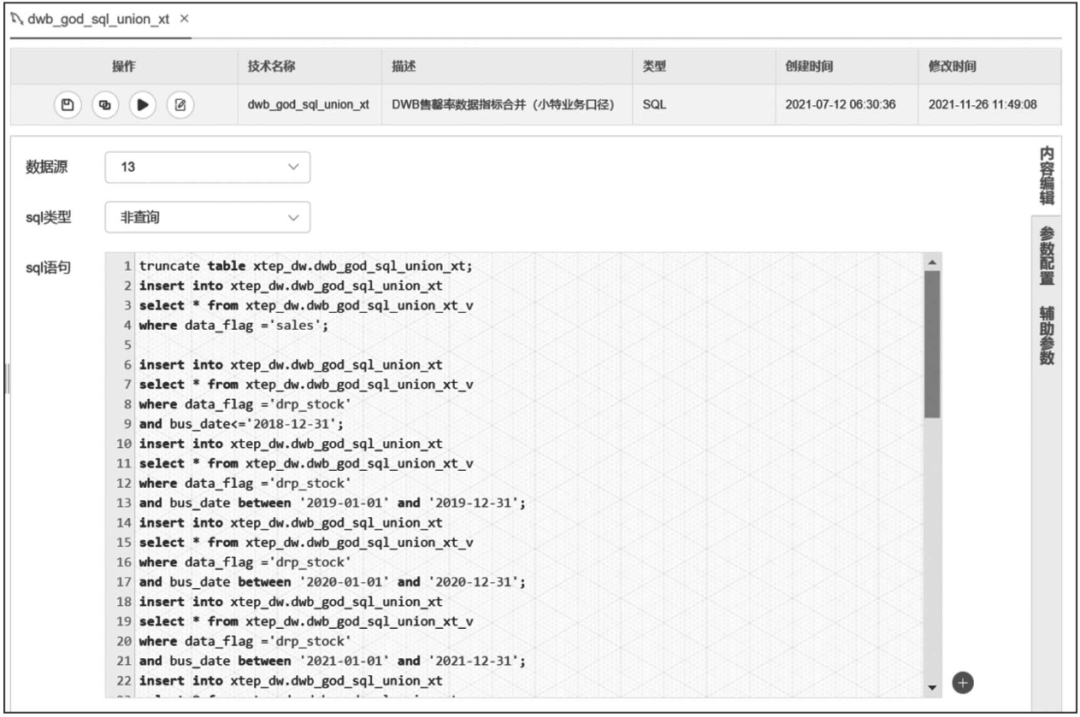 3)数据加工SQL任务。数据加工统一由SQL任务组成,但是针对相同的目标表,会有不同的数据刷新周期,因此SQL任务以“目标表+数据刷新周期”命名。例如dwb_ret_sale_detail_curday、dwb_ret_sale_detail_all分别表示刷新dwb_ret_sale_detail表当日数据和刷新dwb_ret_sale_detail表全量数据。