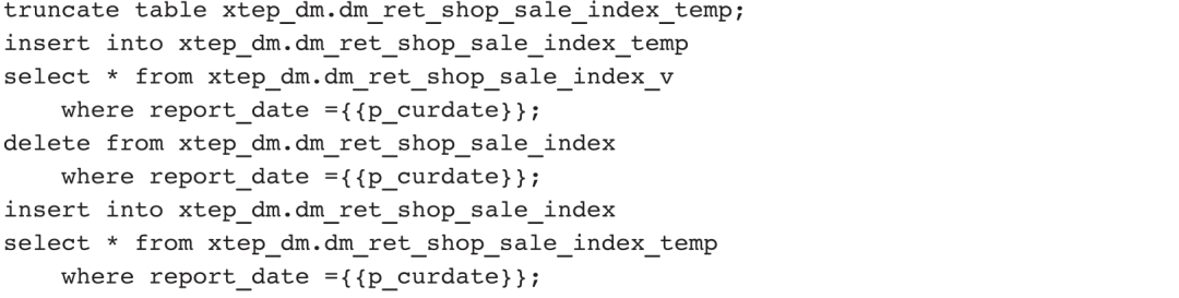 报表数据实时统计任务和增量数据同步任务一样,从9点到24点每半小时循环刷新一次。数据刷新包含面向仓库层的数据刷新和面向报表展示的数据刷新。仓库层的数据由于不涉及展现,可以直接删除以后重新查询,典型的SQL语句如下: