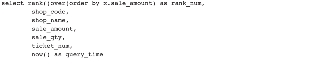 大屏通常还会展现分组汇总数据或者排名数据,以店铺排名为例,其查询语句如下: