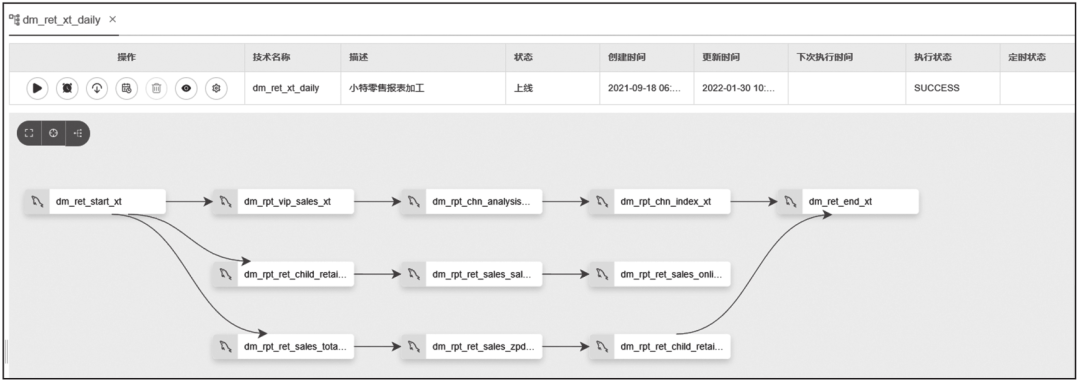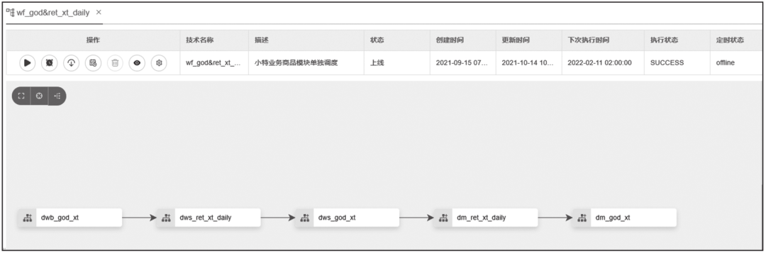 在调度任务之上,按照业务模块组合成工作流。工作流以“模块名+执行频率”命名,例如ods2dwd_ret_10min表示零售模块每10 min刷新一次ODS层数据到DWD层。