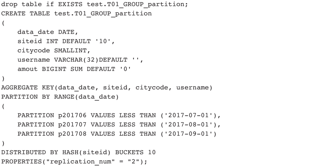 分区表推荐按年分区和按月分区,不推荐按日分区。分区表建表语句示例如下: