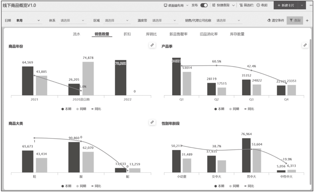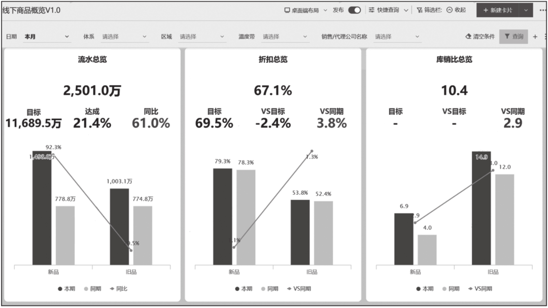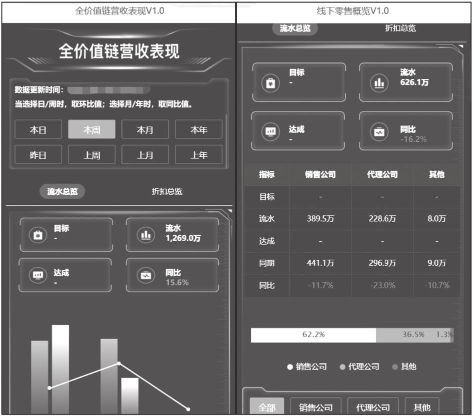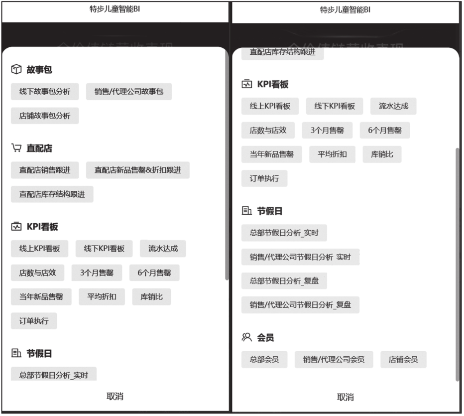 在本次项目中,前端数据可视化采用观远BI分析平台,通过数据库直连的方式读取加工好的数据,按照高管概览、零售、渠道、商品、故事包、KPI看板、直配店、节假日、会员等业务主题进行数据最终呈现,支持用户在平台进行数据查看和下载。可视化结果支持在移动端和PC端查看。