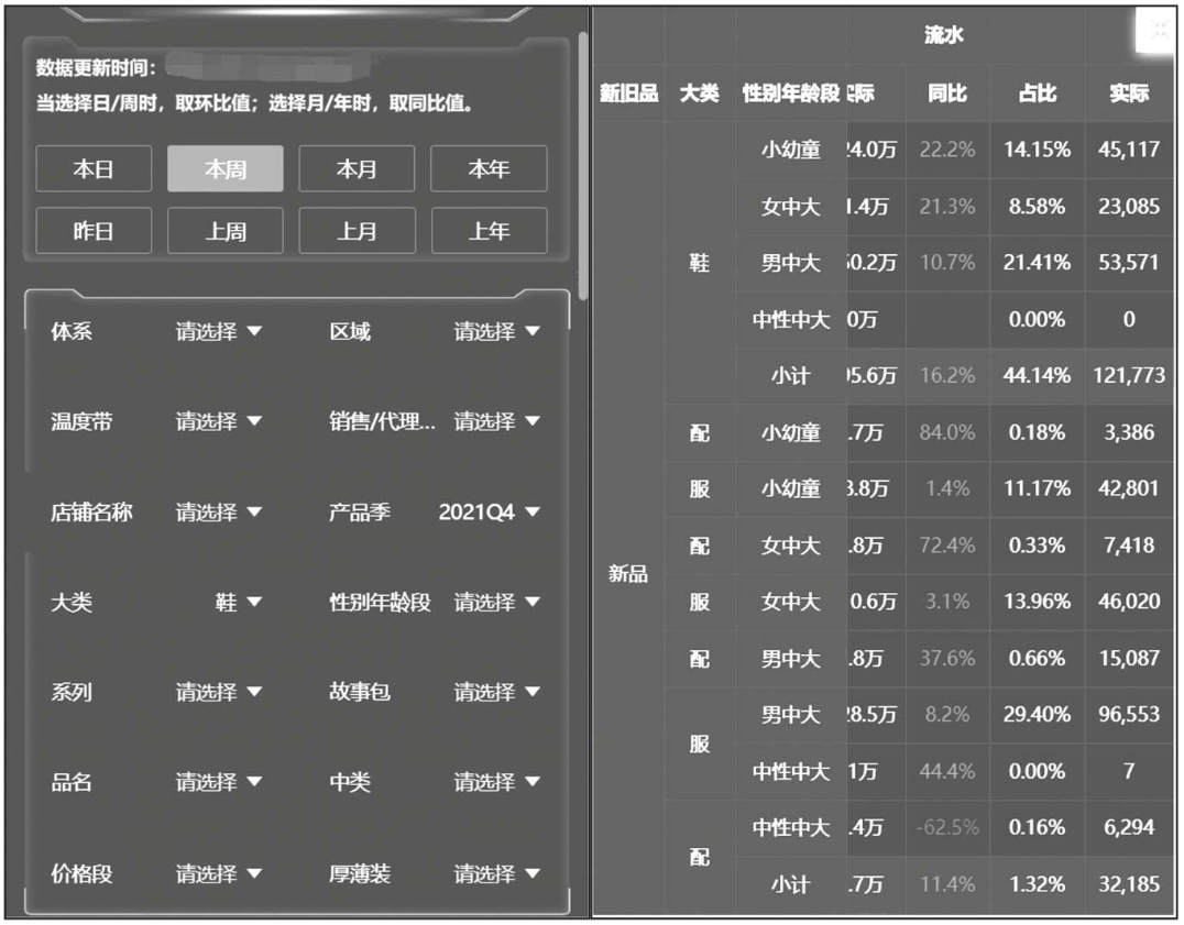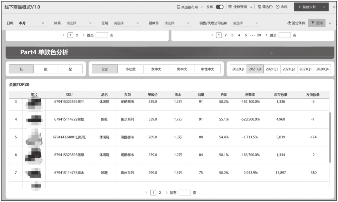 数据仓库ODS层主要对接DRP系统、E3系统、SAP系统和业务补录数据,共接入200余张接口表,其中实时接口表15张、增量接口表10张。在仓库层,构建了店铺、商品、日期、分公司、仓库等6个维度模型,20余个DWD层明层模型,11个整合的DWB层指标模型,9个DWS层宽表模型。在集市层,根据具体报表需求构建了30多张实体表和视图,作为报表查询的数据来源。同时,基于观远BI平台开发了27张PC端报表,并通过App适配到移动端,方便用户随时随地查看数据和分析业务状况。