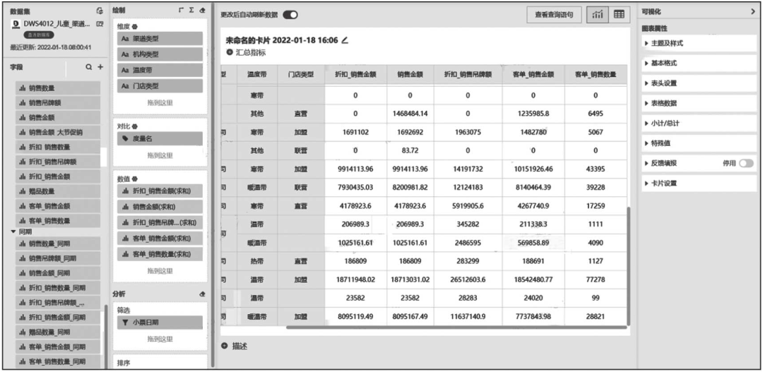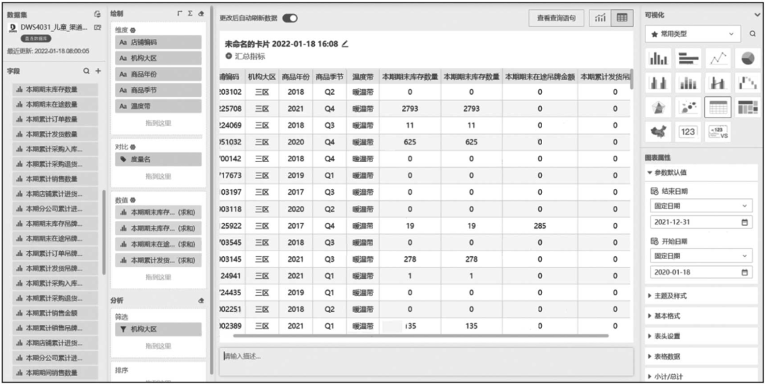 自助分析报表是基于预定义的宽表数据集,自由组合维度指标进行分析后产出的报表。由于使用灵活,自助分析报表受到数据分析师的广泛欢迎。自助分析报表也是本次项目构建的重点,因此我们在项目初期就确定了DWS层的大宽表都要作为自助分析的数据源,最终建设了零售、渠道、会员、进销存和售罄率5个自助分析报表。其中,零售自助分析报表展现效果如图14-21所示,进销存自助分析报表展现效果如图14-22所示。