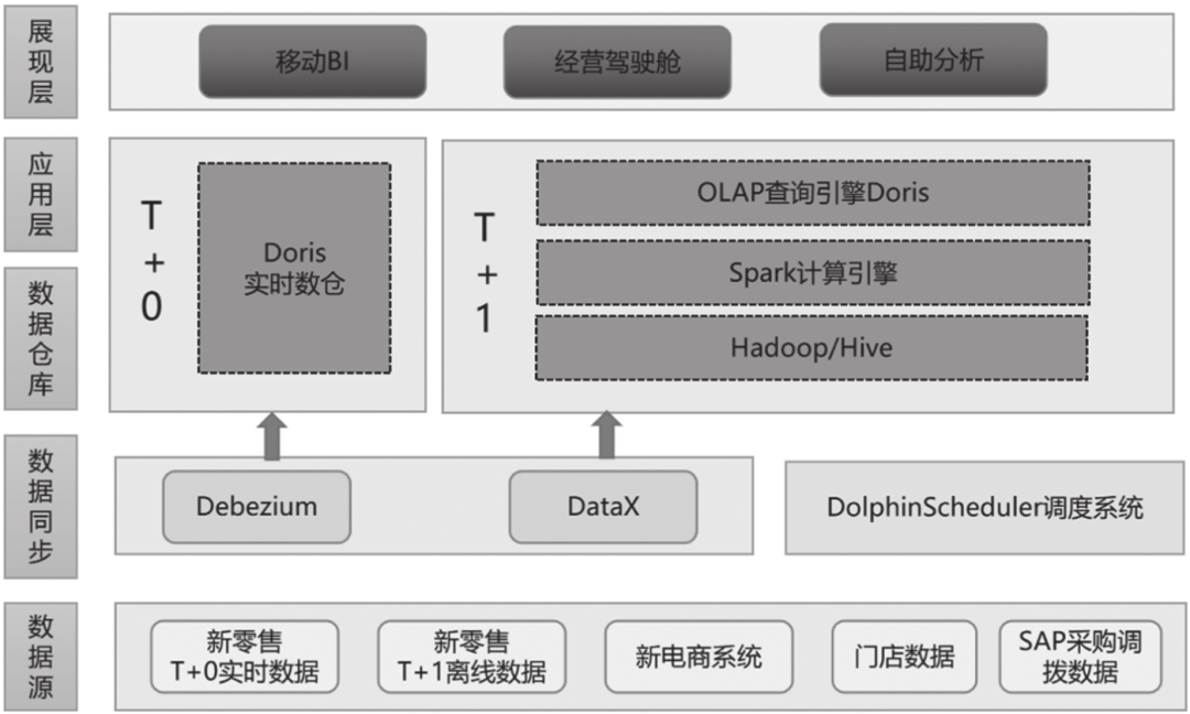 在项目选型阶段,我们先后测试和对比过Hana、Greenplum+Oracle、Hive+Kyligence(kylin商业版)解决方案,最终决定采用Hive on Spark数据加工、DataX数据同步、Doris OLAP查询的开源解决方案。同时为了满足部分零售报表实时数据查询需求,我们在系统中增加了Flink模块,完成实时数据的清洗加工,并将数据最终写入Doris,实现数据秒级查询。此外,我们还采用了集团统一购买的商业BI软件完成移动端报表、PC端自助分析报表和实时销售报表等的呈现。系统整体架构如图13-1所示。
