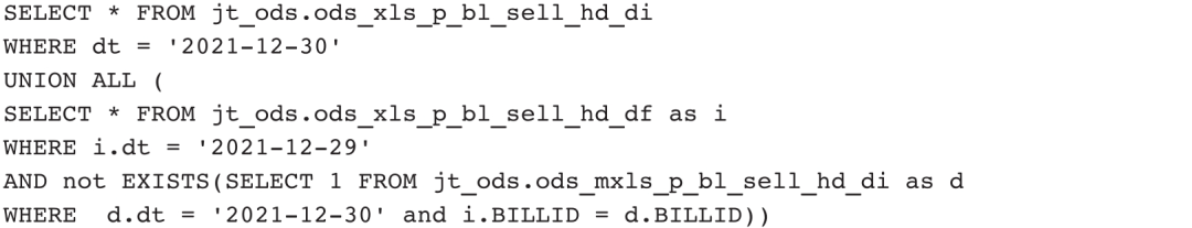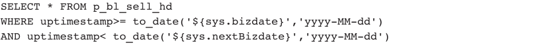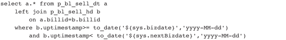 一般情况下,我们只需要抽取最近一天新增或者变化的数据作为增量。以p_bl_sell_hd表为例,抽取增量数据的语句如下: