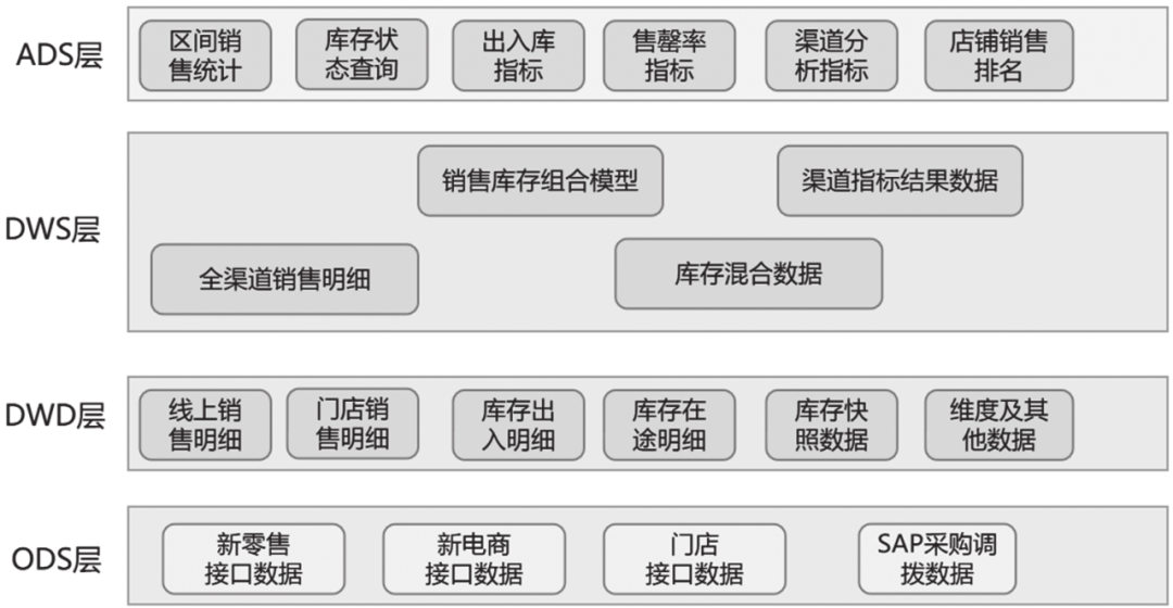DWS层在DWD层的基础上汇总数据并根据业务逻辑计算指标。销售明细模型加工的指标有销售吊牌价、同店销售明细、有效店销售明细等,出入库明细模型加工的指标有物理库存、在途库存、财务库存,需结合库存和销售明细计算的指标有售罄率、动销率、齐码率、库销比等。具体的业务逻辑在后面的业务方案模块展开介绍。