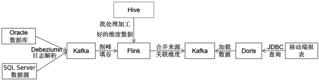在离线批处理基础上,针对销售数据,我们还有实时分析需求。销售数据主要来自Oracle数据库和SQL Server数据库。我们可通过Debezium强大的日志解析功能,读取两个库的CDC日志到Kafka,然后由Flink实时计算平台完成数据的清洗并关联离线批处理好的维度数据,写入Doris。Doris中的目标表采用Unique模型,取多个字段组合作为主键字段,以防数据重复。实时数据加工流程如图13-3所示。