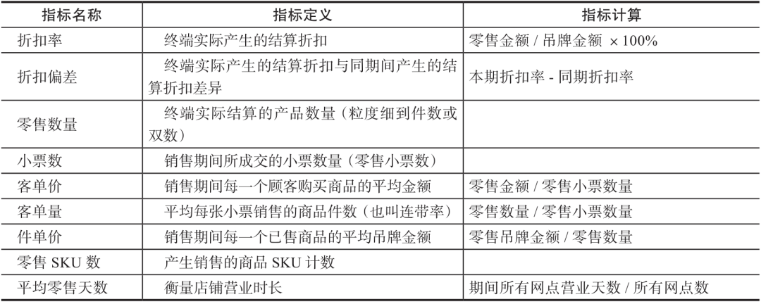 除了上述指标,还有针对每个指标的日、周、月、年等不同周期的同环比,其中金额类和数量类指标的同环比一般等于(本期-同期)/同期,而比例类指标是本期数据减去同期数据,例如周折扣率环比=本周折扣率-上周折扣率。