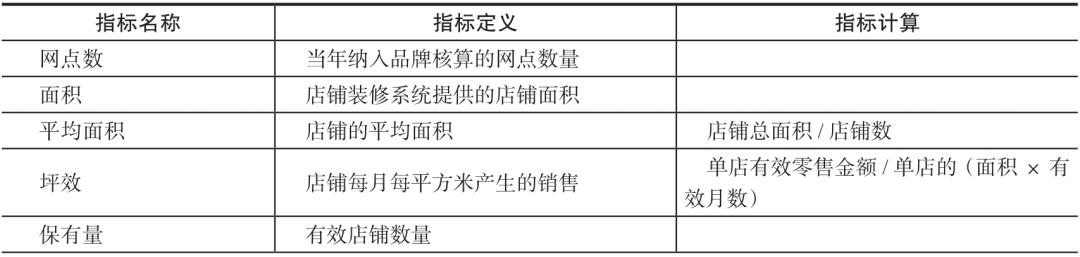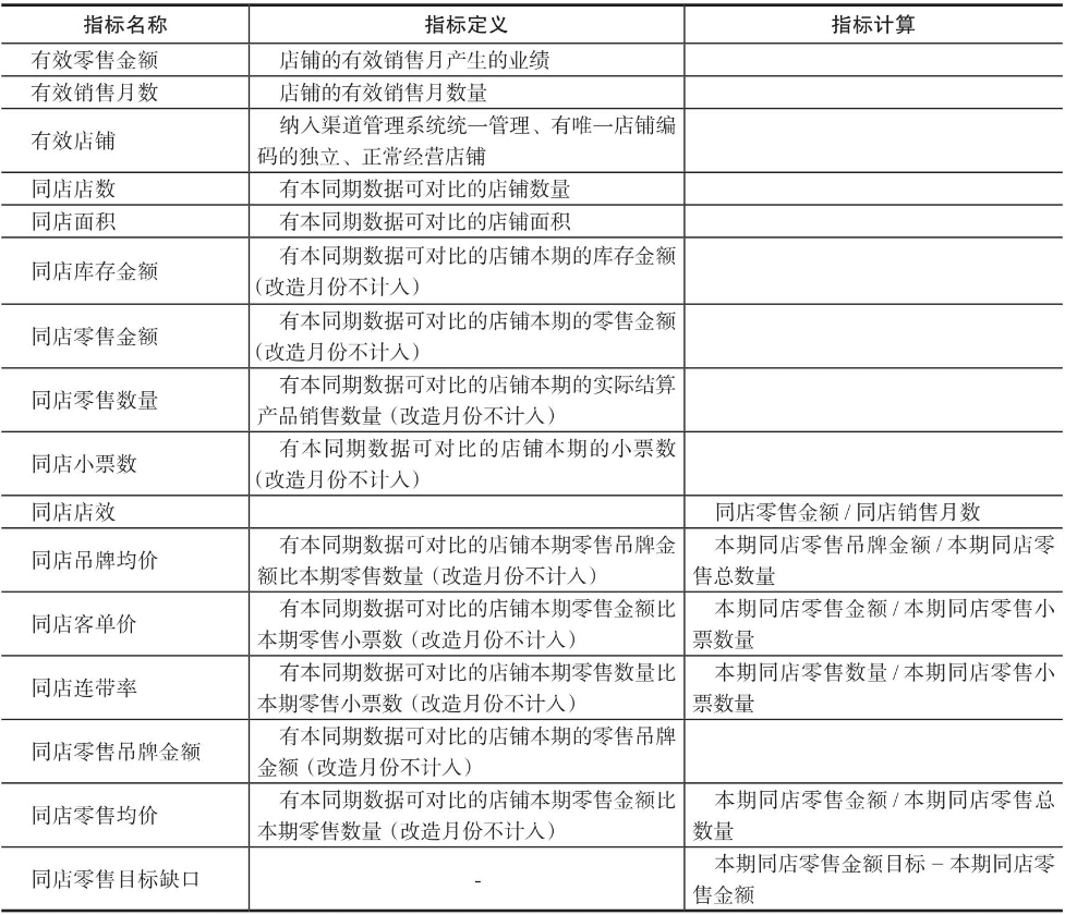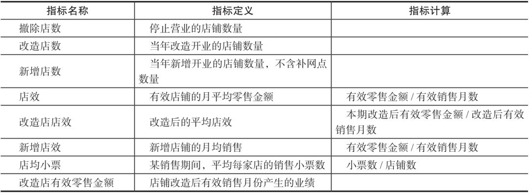 其中,最重要的店铺类型为有效店和同店,由此衍生的有效店及同店指标定义及其计算逻辑如表13-3所示。
