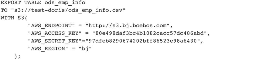 EXPORT是Doris提供的一种将数据导出的命令。该命令可以将用户指定的表或分区中的数据以文本格式,通过Broker进程导出到远端存储系统,如HDFS、BOS等。目前,该方式仅支持对指定表或分区进行全量导出,不支持对导出结果进行映射、过滤或转换操作,导出格式为CSV。导出文件到BOS需要使用S3兼容协议。