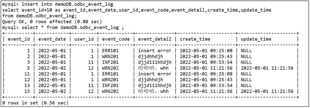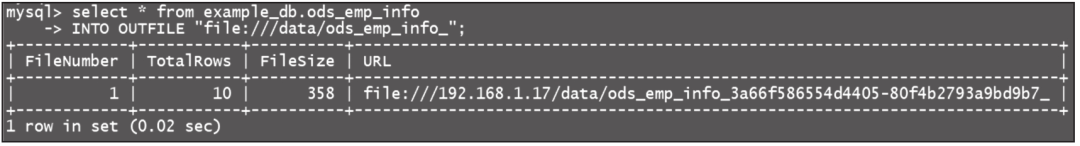 图10-3 导出数据到Doris FE节点的本地磁盘Doris支持通过INSERT命令直接将数据写入ODBC外部表,操作过程和数据写入内部表一样。写入操作是以单ODBC客户端连接方式实现的,因此不建议一次性提交大量数据。继续利用原来创建的MySQL外部表odbc_event_log,向表中写入数据。