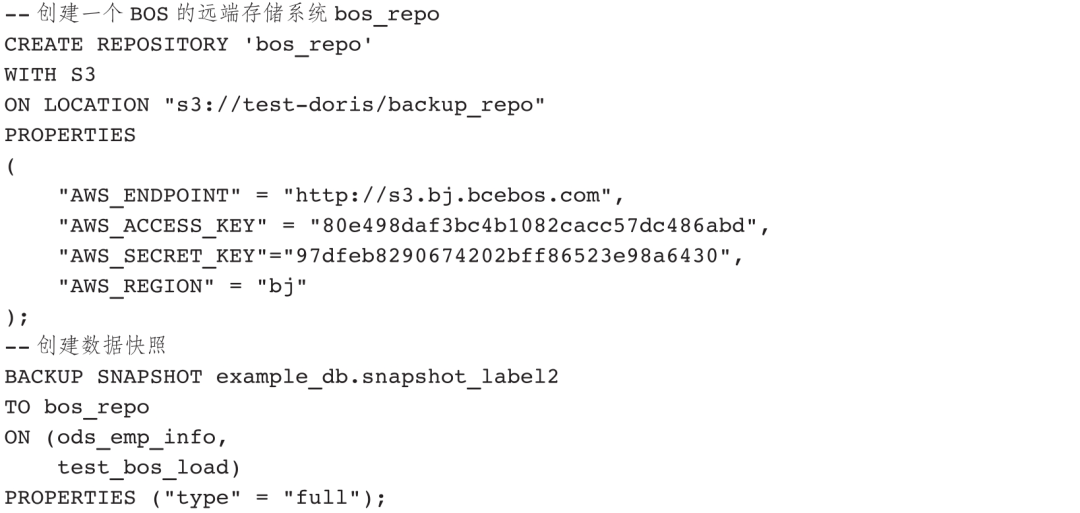 4)备份和恢复操作都不会保留表的colocate_with属性。创建一个BOS远端存储系统,并将数据库表example_tbl中的数据备份到远端存储系统中。