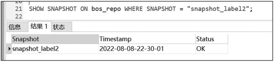 提交备份任务以后,我们还可以通过SHOW BACKUP命令查看最近Backup作业的执行情况,也可以通过SHOW SNAPSHOT ON bos_repo WHERE SNAPSHOT="snapshot_label2"查看远端存储系统中已存在的备份快照,截图如图10-5所示。