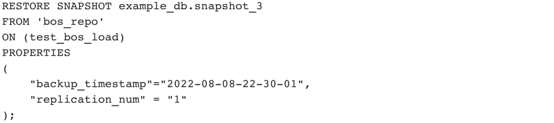 Doris支持最小分区粒度的全量备份(增量备份有可能在Doris未来版本支持)。当表的数据量很大时,建议按分区分别执行,以减小失败重试的代价。如果需要对数据进行定期备份,首先需要在建表时合理规划表的分区分桶,比如按时间进行分区,然后在之后的运行过程中,按照分区粒度定期进行数据备份。因为备份操作的都是实际的数据文件,所以当一个表的分片过多,或者一个分片有过多的文件时,可能即使总数据量很小,依然需要很长时间。用户可以通过SHOW PARTITIONS FROM table_name;和SHOW TABLET FROM table_name;来查看各个分区的分片数量以及各个分片的文件数量,预估作业执行时间。文件数量对作业执行时间影响非常大,所以建议在建表时合理规划分区分桶,以避免过多的分片。一个数据库内只允许有一个正在执行的备份作业。当通过SHOW BACKUP或者SHOW RESTORE命令查看作业状态时,我们有可能会在TaskErrMsg一列中看到错误信息。但只要State列不为CANCELLED,就说明作业依然在继续,这些作业有可能会重试成功。当然,有些错误会直接导致作业失败。数据恢复操作需要指定一个远端仓库中已存在的备份,然后将这个备份的内容恢复到本地集群。当用户提交Restore请求后,系统内部会做如下操作。1)在本地创建对应的元数据。这一步首先会在本地集群中创建数据恢复对应的表分区等结构。创建完成后,该表可见,但是不可访问。2)在本地执行快照。这一步是对第一步创建的表进行快照。这其实是一个空快照(因为刚创建的表是没有数据的),目的主要是在Backend进程中产生对应的快照目录,以便之后接收从远端仓库下载的快照文件。3)下载快照。远端仓库中的快照文件会被下载到第二步生成的快照目录中。这一步由各个Backend进程并发完成。4)快照生效。快照下载完成后,我们要将各个快照映射为当前本地表的元数据,然后重新加载这些快照,使之生效,完成最终的数据恢复作业。从前面bos_repo的备份中恢复表数据,语句如下。