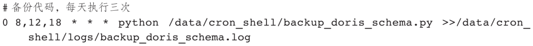 Python作为数据分析最常用的编程语言和脚本语言,也可以很方便地通过MySQL插件连接Doris进行各种操作。下面给出一个具体的案例,通过Python脚本配合Linux Cron表达式,实现每天3次定时备份Doris数据库里面的表、视图等对象的创建语句。这在数据仓库开发中具有非常重要的意义。