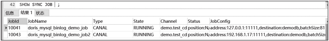 待Binlog Load任务创建成功以后,我们可以通过SHOW SYNC JOB命令查看数据同步作业状态。