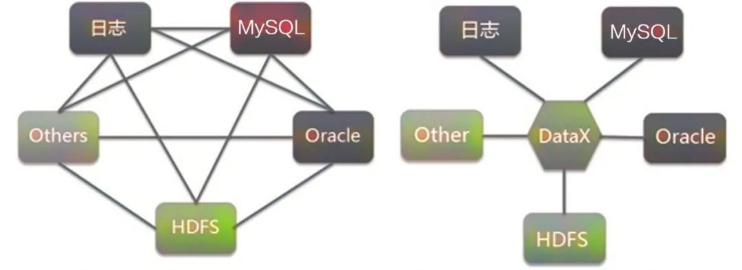 DataX是阿里巴巴开源的一个异构数据源离线同步工具,致力于实现包括关系型数据库(MySQL、Oracle等)、HDFS、Hive、ODPS、HBase、FTP等各种异构数据源之间数据稳定高效的同步。DataX作为离线数据同步框架起到中转作用,将不同来源数据的读取功能抽象为Reader插件,将向不同目标写入数据的功能抽象成Writer插件。理论上,DataX框架可以支持任意类型数据源的数据同步。同时,DataX插件体系作为一套生态系统,新数据源一旦接入即可实现和现有数据源互通。数据同步旧模式和新模式对比如图5-15所示。