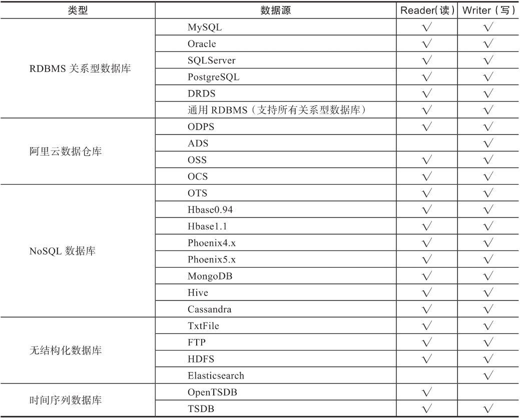 3)FrameWork:用于连接Reader和Writer插件,作为两者的数据传输通道,并处理缓冲、流控、并发、数据转换等核心技术问题。目前,DataX已经有比较全面的插件体系,已接入主流的RDBMS数据库、NoSQL数据库、大数据计算系统等,如表5-2所示。
