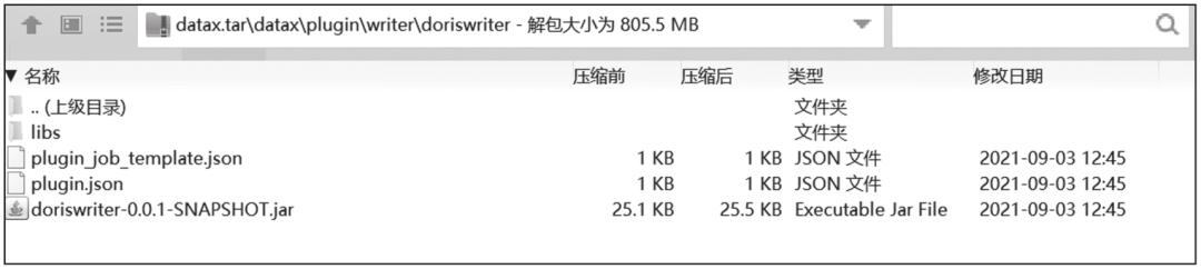 DataX DorisWriter于2021年9月底发布,在GitHub上可获取源码,地址为https://github.com/apache/incubator-doris/tree/master/extension/DataX。这里直接下载张家锋老师编译的DataX Doris Writer安装包,解压后文件如图5-17所示。