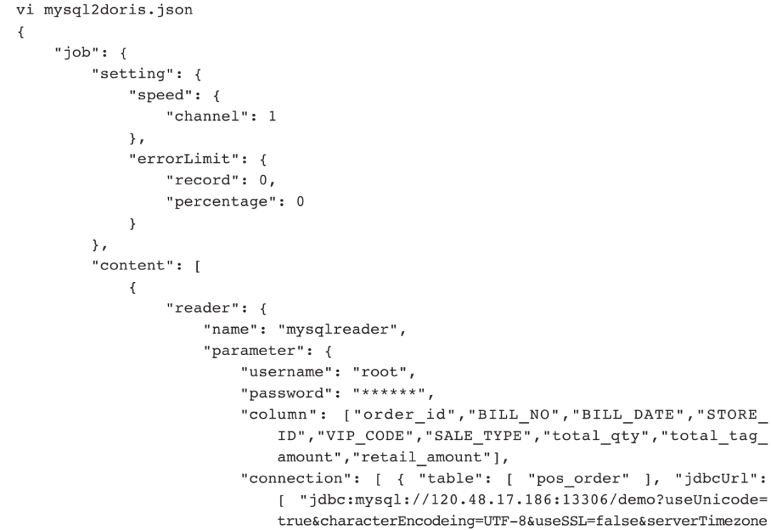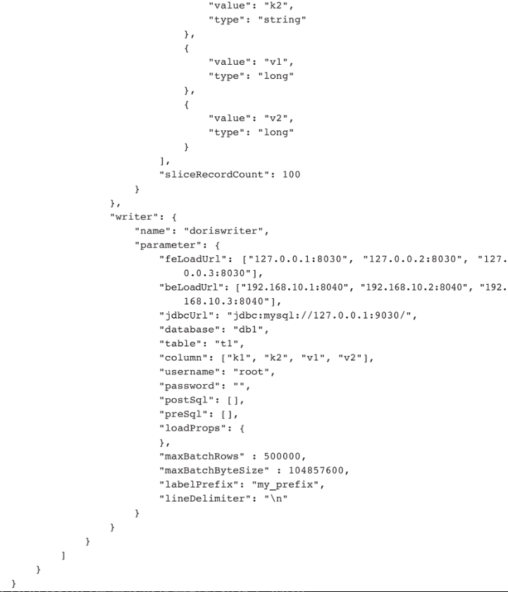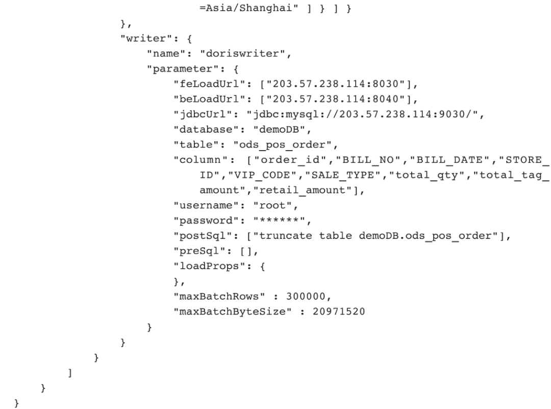 官方提供了一份Doris DorisWriter配置文件,内容如下: