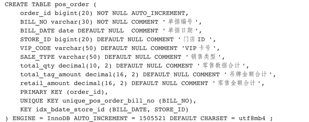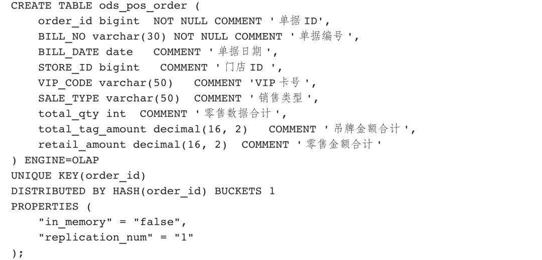 然后,对照pos_order创建Doris表,命名为ods_pos_order,建表语句如下: