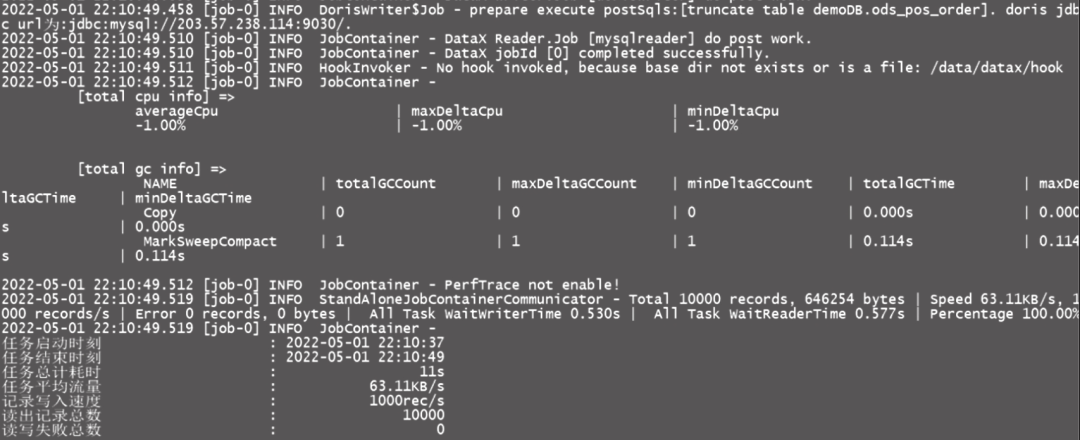 最后,执行DataX命令python data/datax/bin/datax.py mysql2doris.json,执行结果如图5-18所示。