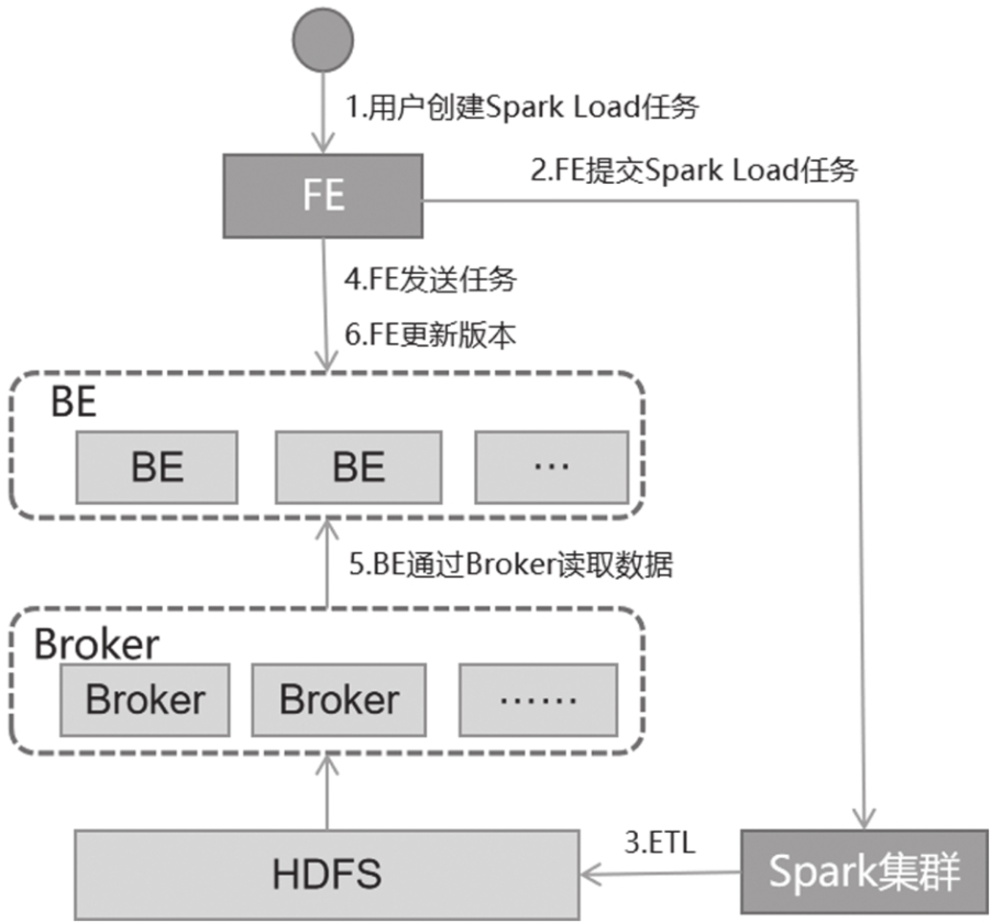 用户通过FE节点提交Spark Load任务,Spark集群读取数据并写入HDFS,FE通知BE通过Broker读取HDFS数据,完成数据导入,具体的执行流程如图5-19所示。