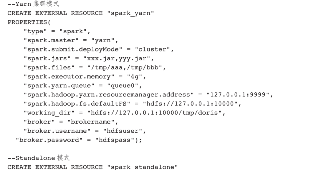 ❑Spark资源参数:Spark资源需要提前配置到Doris系统并且赋予用户USAGE_PRIV权限后才能使用。