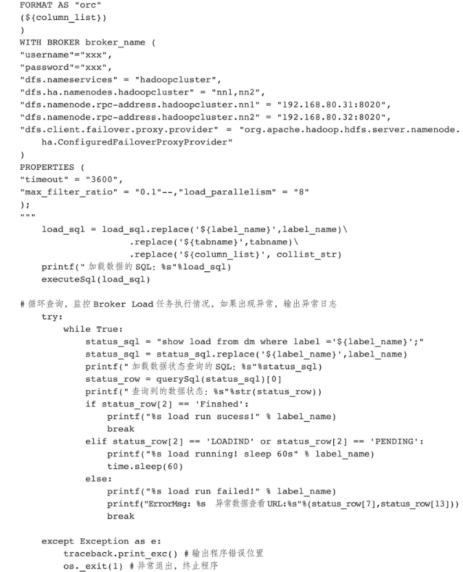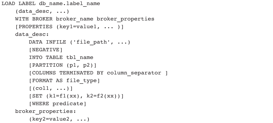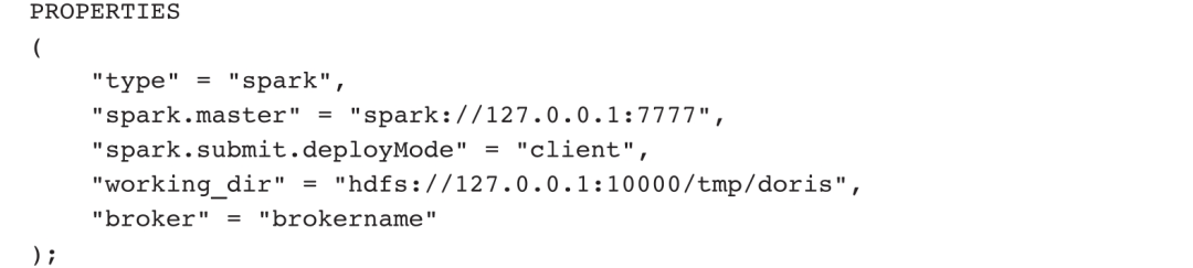 ❑broker:Broker名称,Spark作为ETL资源使用时必填,需要通过ALTER SYSTEM ADD BROKER命令提前完成配置。