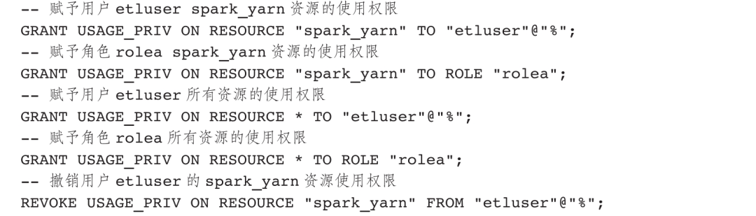 第二步,分配Spark资源使用权限。普通账户只能看到USAGE_PRIV权限的Spark资源,root和admin账户可以看到所有的Spark资源。资源权限通过GRANT REVOKE来管理,目前Doris仅支持USAGE_PRIV使用权限。我们可以将USAGE_PRIV权限赋予某个用户或者某个角色。